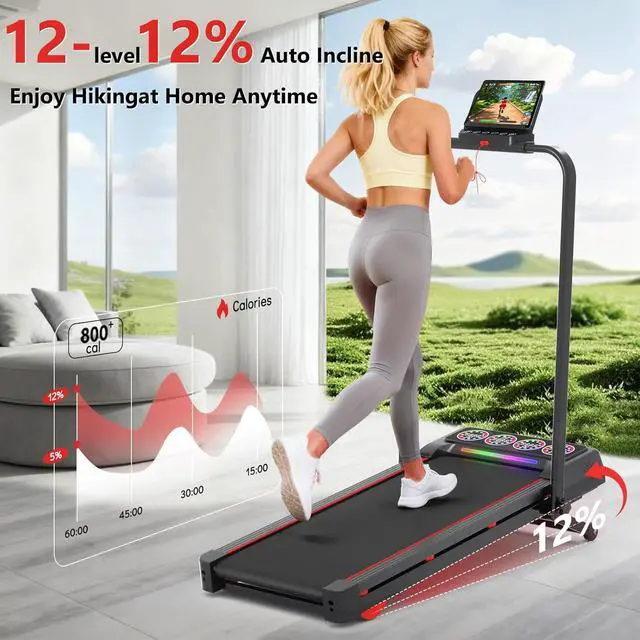 Incline Treadmills: The treadmill has an updated 0-12% 12-level ture 12° auto incline function. Can adjust the incline level automatically with a button, boosts fat-burning efficiency by up to 400%. The function allows you to enjoy the experience of hiking and mountain climbing at home when the weather is bad, help you to improve exercise efficiency