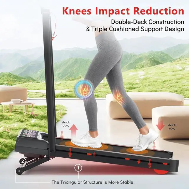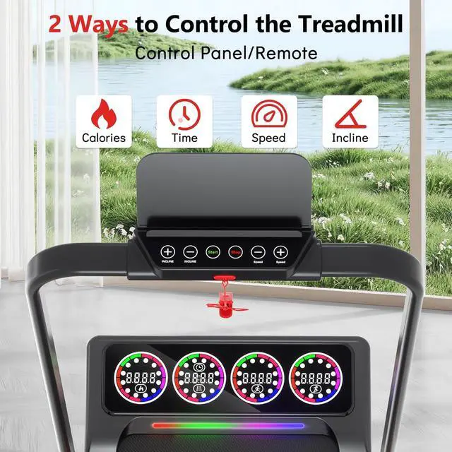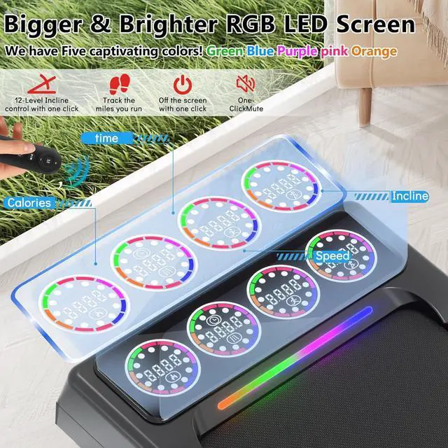 Large Clear RGB LED Screen Triple Cushioned Design: With bigger and clearer RGB LED screen(Six colors-Green, Orange, Red, Blue, Purple, Pink). Can show speed, calories, time, incline level, walk or run distance. And also can help you add up and track the miles, better assist you in fitness. The treadmill adopts double-deck construction, 6 upgraded silicone shock absorption points, 5-layer anti-slip running belts. Help your knees to reduce impact, provide a more comfortable exercise experience