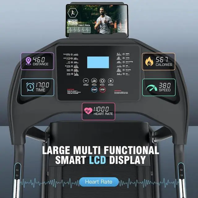 Multi-functional LCD Display & Smart Fitness TrackingCombines cardio exercise with health monitoring in one machine, eliminates need for separate body fat scales. Measure your body fat level easily in a few steps. Easily track workout progress with multi-functional LCD display that shows time, speed, distance, calories burned, and heart rate. The built-in heart rate sensor ensures safer exercise, while the handle buttons and touch screen allow for easy speed adjustments, start, and stop.