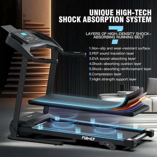 Advanced Safety SystemsSturdy frame ensures stability during workouts, providing a secure platform. Composed of 7-layer non-slip and shock-absorption, FUNMILY treadmill running belt not only provides effective cushioning for your joints, muscles, knees and ankles but it also provides a comfortable exercise experience. With safety lock, home treadmill protect you better in emergency.