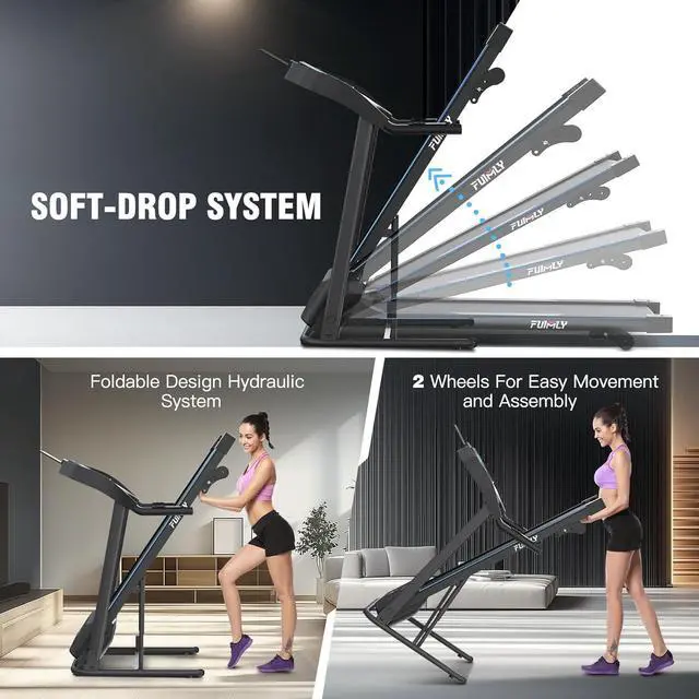 Easy Assembly & Space-SavingOur treadmill for home comes 95% pre-assembled, requiring only a few screws to complete setup. Equipped with a hydraulic system, it prevents damage to your floor or equipment when unfolding. Plus, our soft drop technology allows for easy folding of the running deck by one person in just seconds. When not in use, it conveniently folds to a compact size of 24 x 25 x 48. The built-in transport wheels make it easy to move and store.