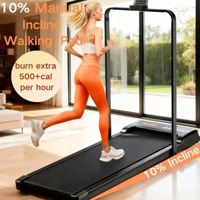 [10% Manual Incline for Effective Calorie Burn] Reach a 10% slope by adjusting the front support feetsimulating outdoor hill climbing to burn up to 500 calories in 30 minutes. A versatile foldable treadmill with incline that shifts quickly into climbing mode for an efficient incline walking pad with handle bar workout.