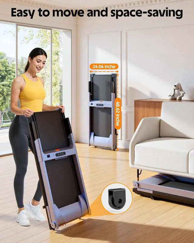 Treadmill for Home Small Spaces Compact foldable treadmill fits apartments and small rooms; store under furniture and roll away on built-in wheels