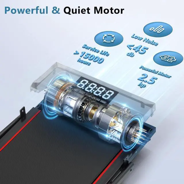 Compact Portable Design: The walking treadmill weight is only 41.9 lbs and measure is 46.45 x 21.45 x 4.45 in, making it is very space savings. It can be moved easily and placed under your desk, bed, or sofa. Whether at home or in the office, it' s very convenient for you to exercise