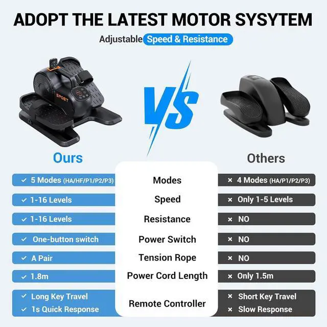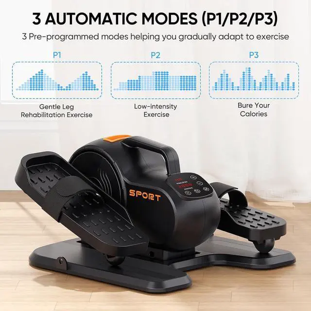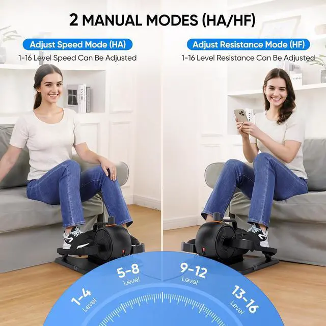 3-IN-1 with 5 Modes 2 manual modes: HA mode (16 adjustable speeds) and HF mode (16 adjustable resistances). Two manual modes allow you to develop better leg exercises that suit you. 3 automatic modes(P1/P2/P3) Each automatic mode has a pre-set movement speed, resistance, and direction, with no cumbersome operation, press the start button, and you can enjoy a comfortable exercise, very suitable for elderly people with inconvenient operation