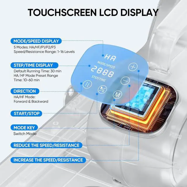 Touchable LCD Digital ScreenThe high-definition LCD digital screen displays real-time data such as exercise speed and time comprehensively records your exercise status, and lets you control your exercise plan better. We have also equipped the display with a touchscreen function, so you can adjust the exercise mode you want with just a light touch