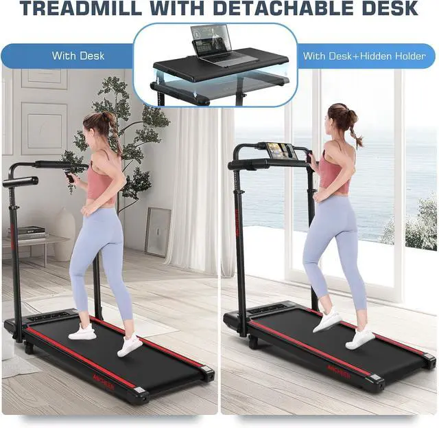 8-in-1 Folding TreadmillANCHEER upgraded treadmills provides multifunctional 8-in-1 function, providing: walking/incline mode, brisk walking/incline mode, work/incline mode and running/incline mode. Not only is it equipped with a detachable table, but it also has an adjustable height function, which is very suitable for office use and is an ideal choice for those who want to seamlessly combine work and exercise. It allows you to watch TV while walking, or relax and exercise at any time