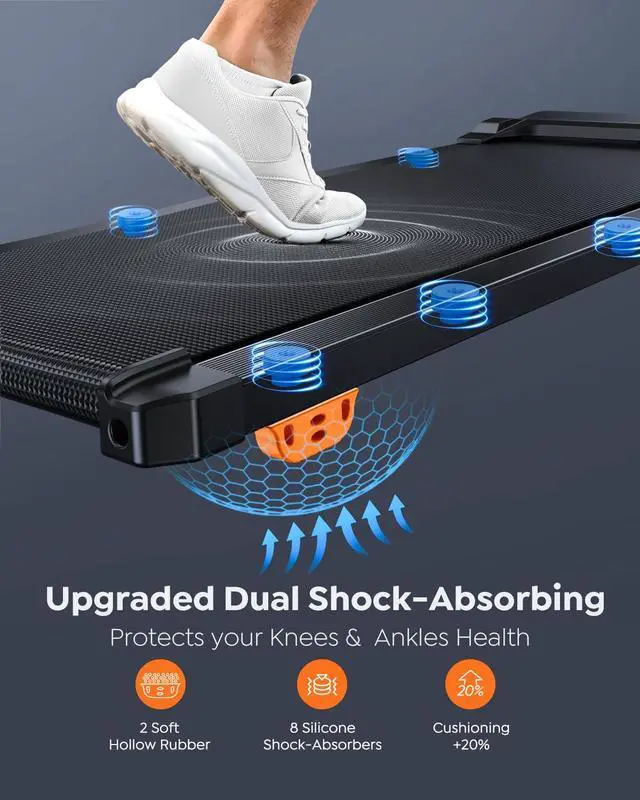 Silent Shock Absorption SystemWalking pad treadmills for home office equipped with 8 silicone shock absorbers and 2 rubber pads (more shock absorption than other products), greatly reducing joint pressure and ensuring a smooth, quiet walking experience. Perfect for walking while at your desk or watching TV, without disturbing others.