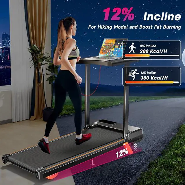 12% Incline Treadmill with Double-Thick Wide Belt- This QYDS compact treadmill features a 12% manual incline, offering a challenging workout while reducing impact on your knees. The walking pad treadmill with desk workstation 300 lb capacity includes a 7-layer non-slip shock-absorbing belt and 4 silicone column supports, providing protection for knees, legs, muscles, ankles and joints