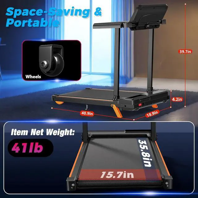 Easy Assembly, Compact, and Portable- This lightweight 2 in 1 folding treadmill comes 90% assembled. Its wide belt ( 35.8 x 15.7 inches) provides comfort, while the unfolded size ( 40.9 x 18.9 x 4.2 inches) allows easy storage, saving space in your home. Built-in wheels make the walking pad treadmill with desktop easy to move and store