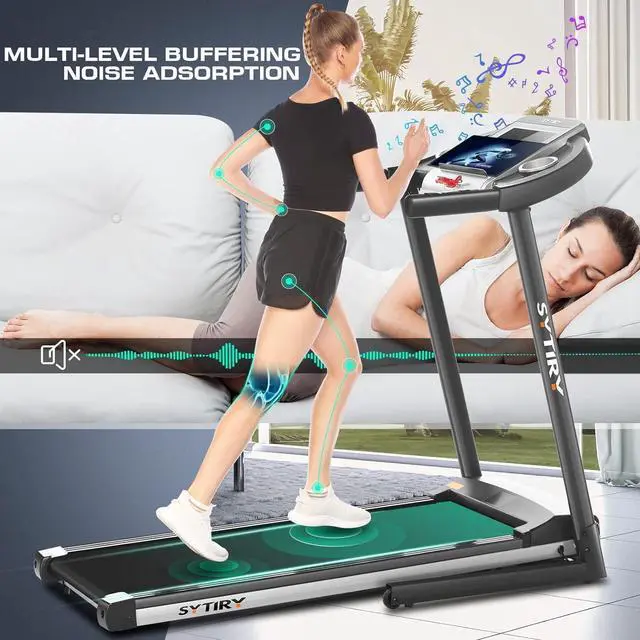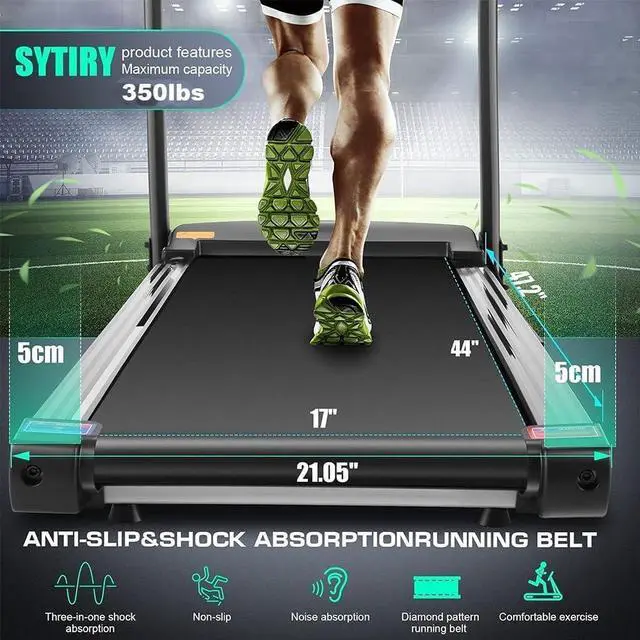 Damping System & Hydraulic Drop The tread surface features a sophisticated damping system for a natural, joint-friendly running experience that protects your knees. The SYTIRY Treadmill is equipped with a hydraulic system that prevents damage to the floor or equipment when unfolding. With a 44" x 17" belt area, it provides plenty of space.