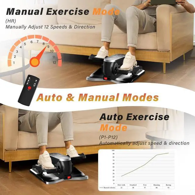 Auto and Manual Modes: iHomey under desk elliptical machine offers both manual and automatic modes to meet different workout needs. In manual mode, it supports 12 speed settings and allows the pedals to move forward or backward. In automatic mode, you can select from 12 preset programs (P1-P12) by repeatedly pressing the mode button, providing a diverse fitness experience