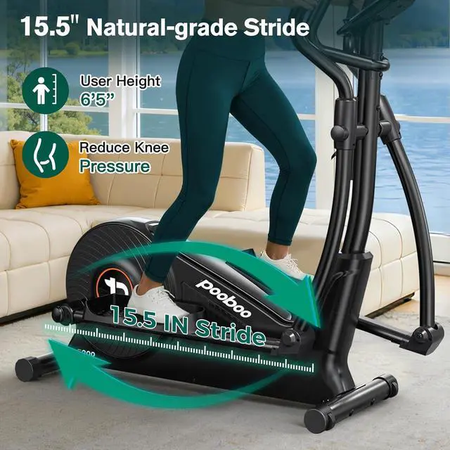 Built with Gym QualityThe thickened steel pipe frame contributes outstanding stability and loading capacity of 350 LBS. The 15.5 " -17" stride simulates the natural movement path of human body and height fits up to 6' 5". The extra wide and non-slip pedals give you a comfort elliptical exercise. The incredible comfort makes it easy to committed to your fitness programs. With each stride, you' ll feel inspired to push yourself further.