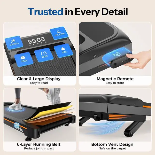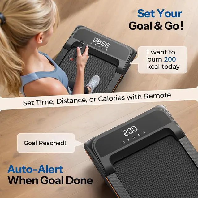 Smart Preset Your Goal: Set custom goals for time, distance, or calories on portable treadmilland get a gentle alert when you achieve them. Stay motivated with clear progress tracking, perfect for building healthy habits while working. Move with purpose, finish with pride