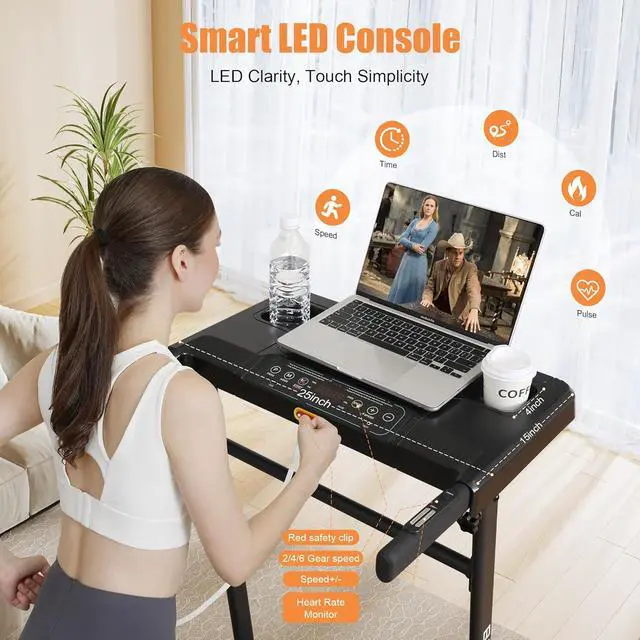 [Spacious All-in-One Workstation Desk] Features a large desk (25" L x 15" W) that holds a full laptop, two 4" x4" cup holders, a foldable tablet groove, and a built-in LED console for real-time tracking and control of speed, time, and calories. This foldable treadmill with incline is designed to double as a walking pad with desk, perfect for compact spaces.