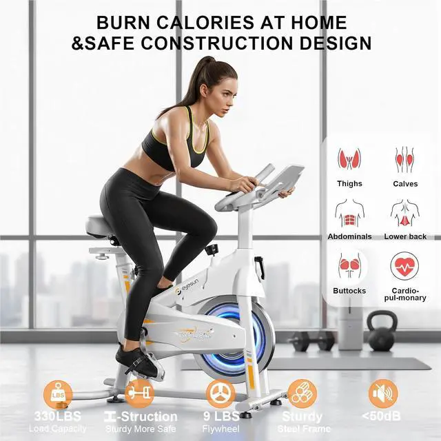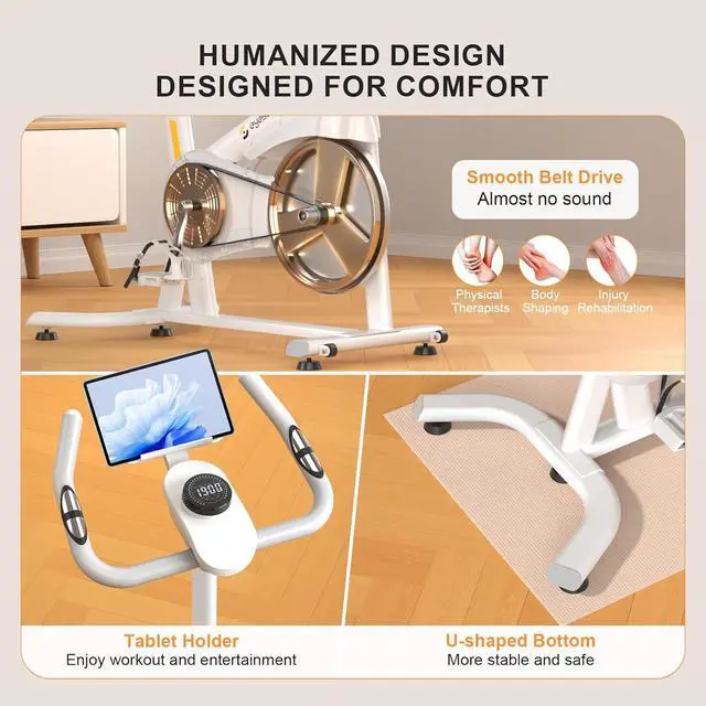 & Comfortable Ride: Crafted with a heavy-duty steel frame and 9 lbs flywheel, this stationary exercise bikes delivers a smooth, quiet, and stable rideideal for home use without disturbing others. Designed for all fitness levels, it features adjustable resistance, a multi-grip handlebar, shock absorption for added comfort, and safety-enhancing cage pedals with an instant stop bar. Dual water bottle holders and built-in transport wheels make every workout safe, convenient, and effective.