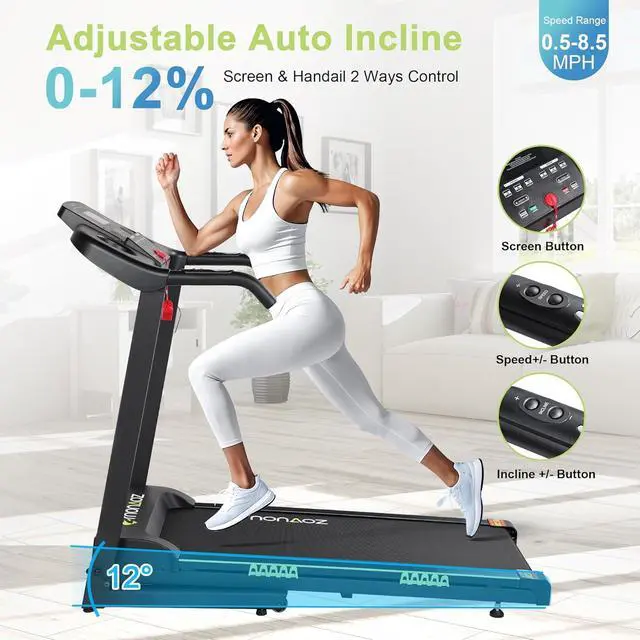 Auto Incline Brushless Treadmill12% auto incline treadmill with 3.0HP silent motor supports a max 8.5 MPH speed which is ideal for walking, jogging, and running. To help you meet a variety of fitness goals and offers a quieter and smoother running experience.
