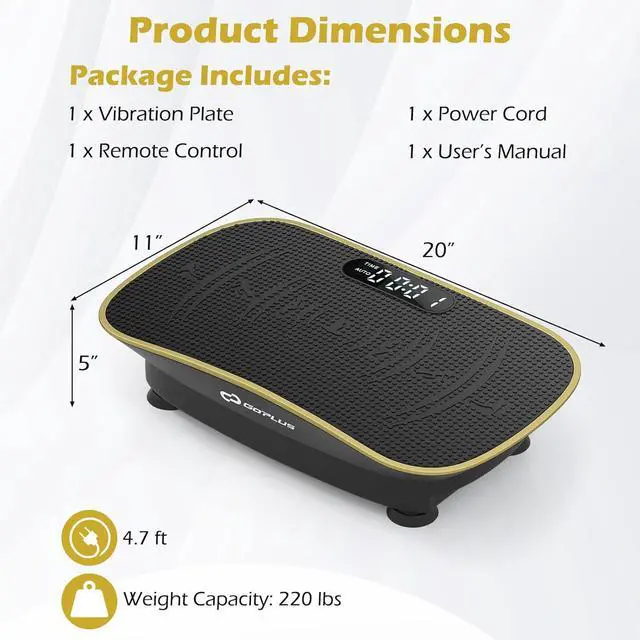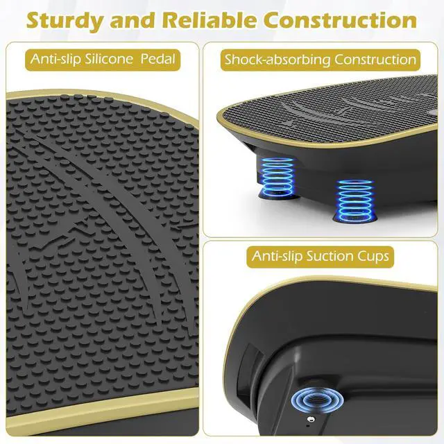 Curved Platform Design Goplus curved vibration plate with unique curved silicone design perfectly outlines the natural curve of your arch, providing secure support for your feet. Besides, it creates natural oscillating motion that' s gentler on joints while maximizing lymphatic drainage benefits.