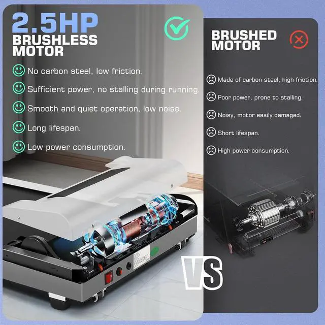2.5HP Brushless MotorThe under-desk treadmill is equipped with a brushless motor, offering more efficient and stable operation. Compared to traditional brushed motors, brushless motors have a longer lifespan, lower noise levels, and higher energy efficiency.