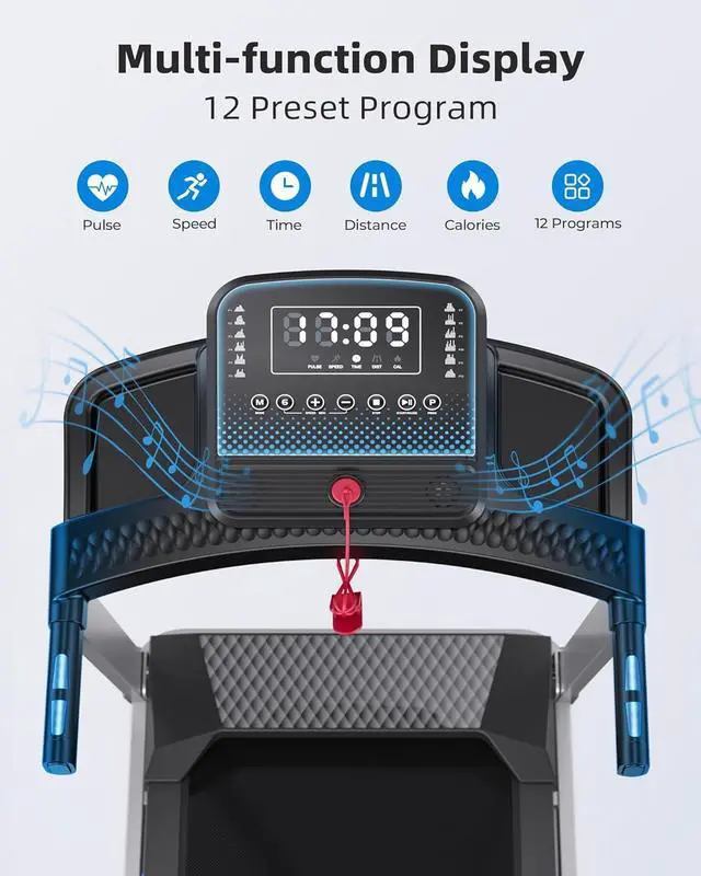- - The walking treadmill is equipped with a multifunctional console with a range of functions including control of on/off, speed, and monitoring of essential data such as speed, distance, time, heart rate, and calories burnt via the large LED display. Play your favourite music while exercising with the 2 built-in Bluetooth speakers. There is plenty of storage space for items such as earphones, mobile phones and tablets