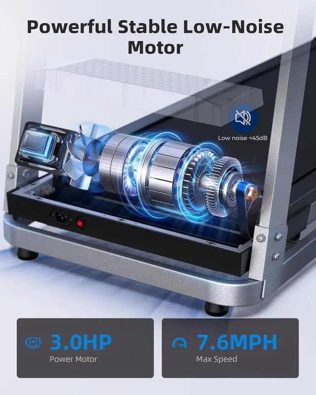 . - Boasting impressive power with a 3.0 HP motor, this electric treadmill provides a challenging workout experience with the ability to accommodate weights of up to 350 lbs, and a maximum speed of 7.6 mph. Experience stable operation with minimal noise at 45dB, ideal for home use without disturbing others