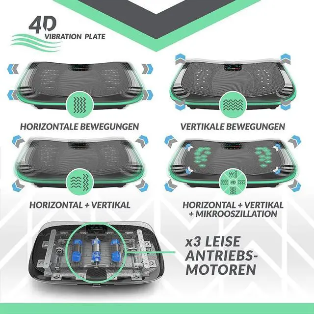 MOTION: The 3 silent drive motors deliver Vibration, Oscillation and Micro Vibration, separately, together, or all three at the same time! This vibration plate gives you a workout like no other to help you tone your body at home.