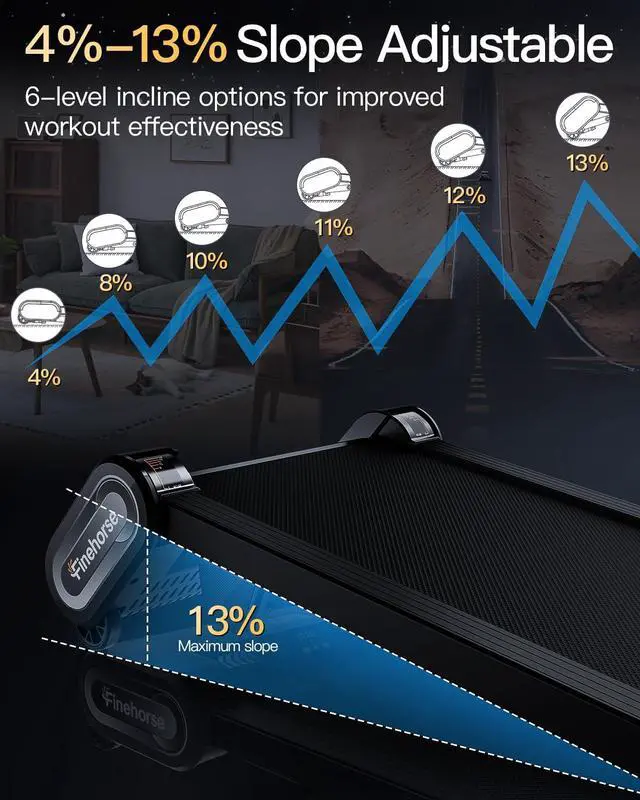 Home: The Akluer walking pad treadmill features an auto incline function adjustable from 0%-13%(0%-4%-8%-11%-12%-13%). The foldable treadmill with incline feature more realistically simulates hill climbing than regular traditional walking pad treadmill. It can optimize your workout, boost calorie burn, and make your exercise time more efficient. The foldable treadmills no-kickplate design ensures a smooth and unobstructed running experience.