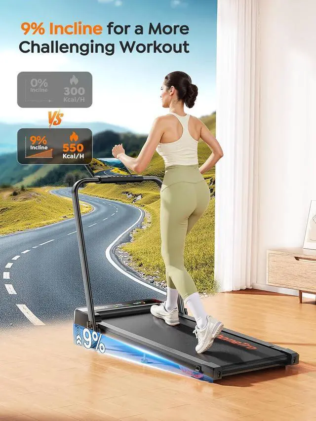Incline: The HomeTro incline treadmill offers four versatile modes: work-walking, casual walking, running, and fat-burning running. Speeds range from 0.67. 5 mph with the handle raised and 0.65 mph when lowered. Its 9% incline is easily adjustable without tools, simulating realistic uphill workouts to help you burn more calories efficiently. It is suitable for many family members, including office workers, seniors, and even pets.
