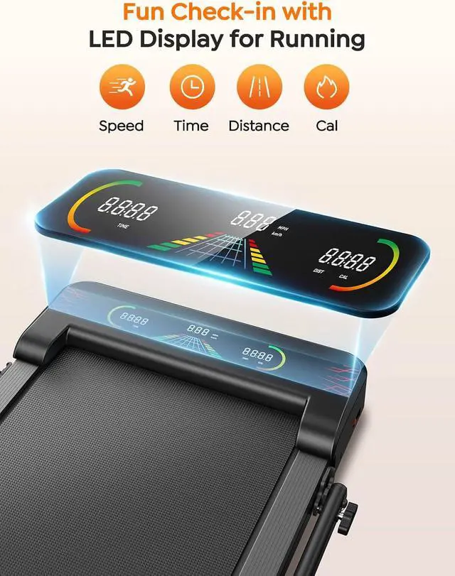 Fun & Clear Tracking: This walking pad features an RGB LED display on the running machine that lights up dynamically based on your workout progressadding interactive fun and a motivating visual experience. A second LED display on the handrail clearly shows speed, time, distance, and calories burned. The dual LED displays clearly show speed, time, distance, and calories burned, ensuring full visibility and real-time data in every mode.