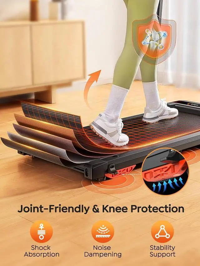 Enhanced Safety & Comfort: A 5-layer non-slip shock-absorbing belt provides effective cushioning for your joints and muscles, ensuring a safe and comfortable workout. the foldable handlebar provides extra support for balance, and a built-in phone/tablet holder lets you enjoy entertainment while exercising. the walking pad with incline is also equipped with a safety key that shuts off immediately in case of an emergency.