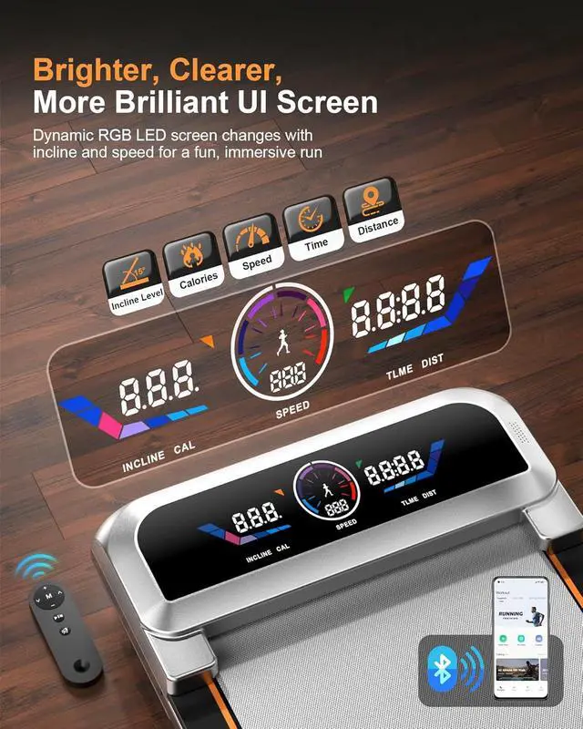 Dynamic LED UI Display with Visual Feedback: Elevate your treadmill workout with a dynamic LED UI display that transforms real-time metrics into a vibrant light show synced to your speed. Watch speed, time, distance, calories, and incline level come to life through color and animation. This visually immersive screen turns every session into an engaging, interactive fitness experience.