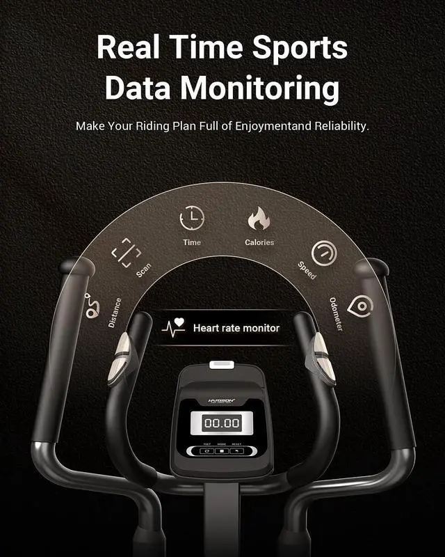 LCD PERFORMANCE MONITOR & COMFORT-FOCUSED DESIGN The HARISON elliptical exercise machine includes an easy-to-read LCD monitor that tracks time, speed, distance, calories burned, and pulse. Ergonomic pedals and handlebars support a smooth, comfortable stride, making this home elliptical machine suitable for longer daily workouts