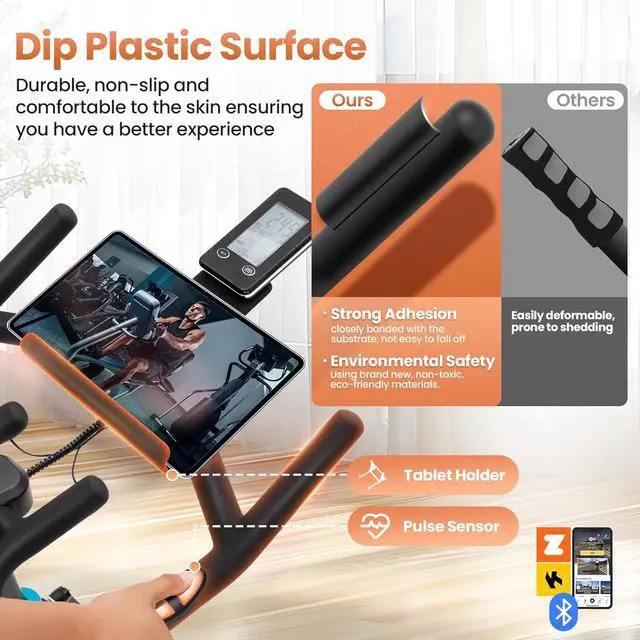 Comfort & Safety Our exercise bike prioritizes comfort and safety with handlebar grips made from professional-grade materials, ensuring durability, non-slip grip, and a comfortable feel against your skin for an enhanced experience. The soft seat cushion provides exceptional comfort, featuring a hollow center design for excellent breathability. Designed for stability and durability, the exercise bike supports up to 400 lbs max weight