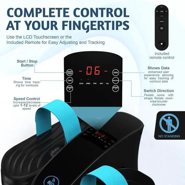 Smart Progress Tracking The large LCD tracks time, distance, speed, and calories burned. Stay motivated with this pedal exerciser for seniors and monitor every session. Adjust settings quickly using the remote or touchscreen panel.