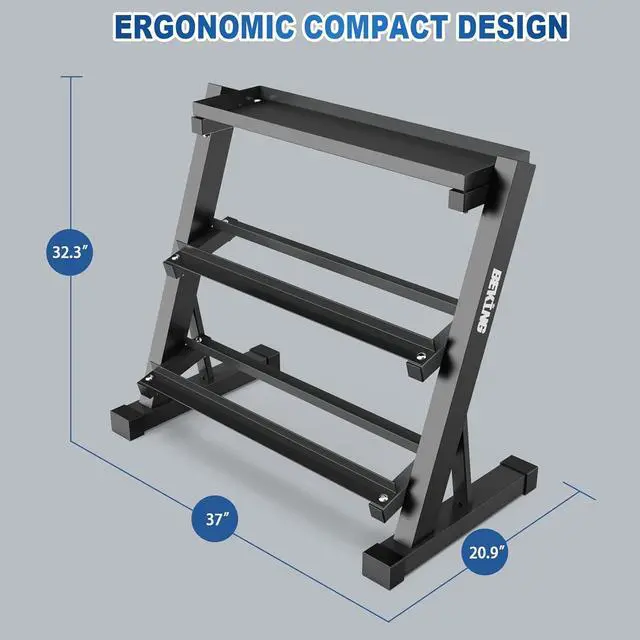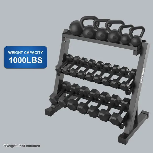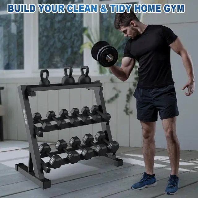 MAXIMIZE YOUR SMALL HOME GYM Tired of weights cluttering your floor? 3-Tier Design Doubles Your Floor Space. This multifunctional weight storage rack vertically stores all your gear (different size of dumbbells, kettlebells, medicine balls and other weightlifting tools) on three levels. The space-saving organizer clears trip hazards instantly, transforming a cramped corner into an efficient, professional-grade workout zone.