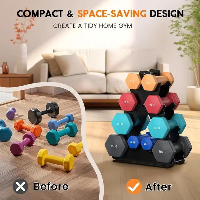 [ Space-Saving Small Weight Rack ] Our weight rack for dumbbells is designed to maximize vertical storage, making it a perfect fit for home gyms, offices, or apartments. With assembly dimensions of 13.39 " L x 3.67 " W x 16.96 " H, this efficient 4-tier layout can hold up to 5 pairs of dumbbells. It is compatible with a variety of small medium neoprene, hex, and cast iron options ranging from 3 to 15 lb. Our small dumbbell rack will help you create a tidy and safe gym space that you' ll love!