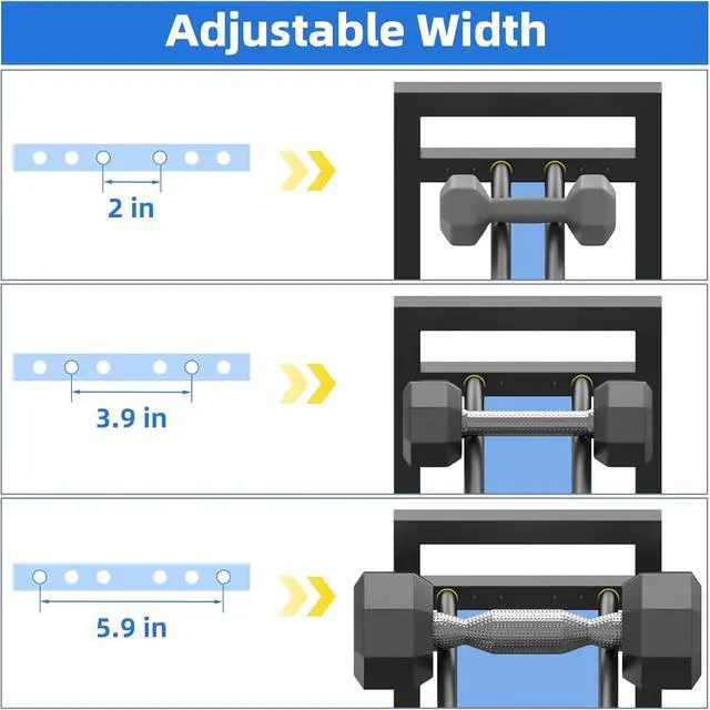 [Adjustable Width]: Each supporting bar of kettlebell rack has three width settings. This flexibility lets the rack fit not only dumbbells of various sizes but also other small fitness equipment like resistance bands or small weight plates, adapting to your diverse storage needs effortlessly