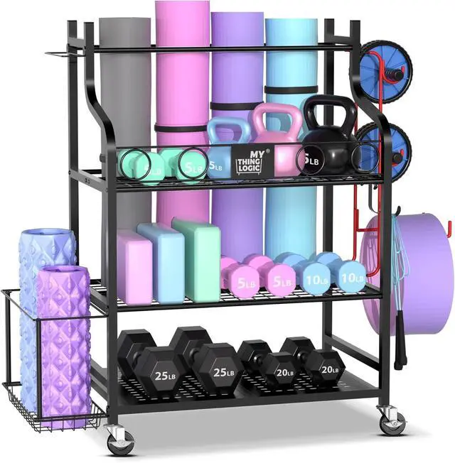 STORAGE VARIOUS ITEMS: This workout storage organizer can help to store your yoga mat, dumbbells, kettlebells, yoga brick, resistance band, roller wheel, foam roller etc.. Perfect for fan of yoga.