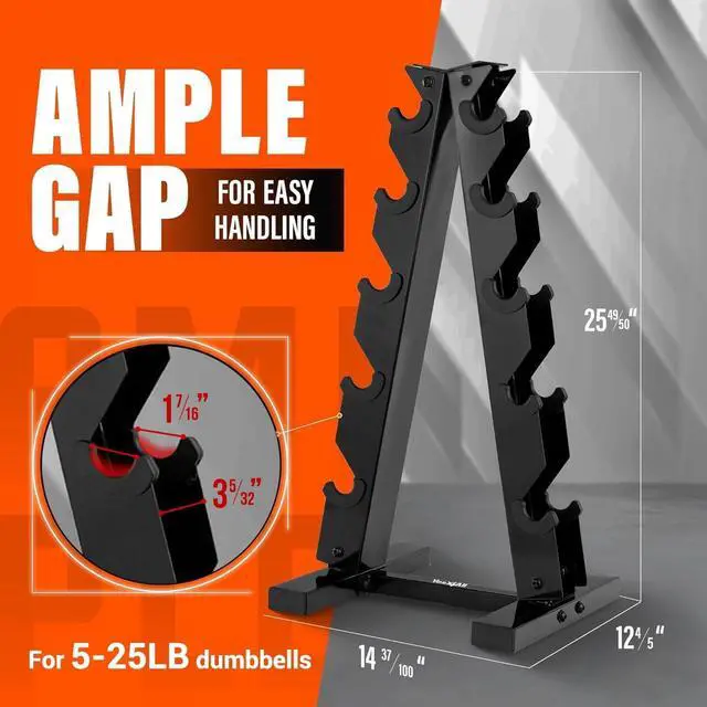 WIDE SLOT ON WEIGHT HOLDER: Wider spacing on strength training dumbbell racks offers additional stability and ease of access when storing and retrieving dumbbells; Dumbbell rack 5 tier accommodates various sizes, 5-25 LBS set, securely without risk of falling