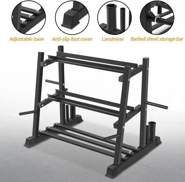 Multi-functional StorageThe weight storage rack is equipped with a 3-tier dumbbell storage rack and four barbell storage bars. Not only can you store a variety of dumbbells, but there are also dedicated storage locations for kettlebells, barbells and barbell plates.