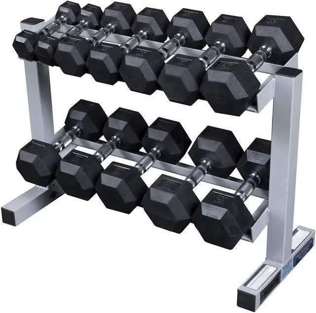 SPACE-EFFICIENT DESIGN: The Body-Solid Dumbbell Rack features a 2-tier horizontal design that fits comfortably in your home gym space. Its compact footprint allows for easy placement in any corner or against a wall, maximizing your workout area for a variety of strength training exercises.