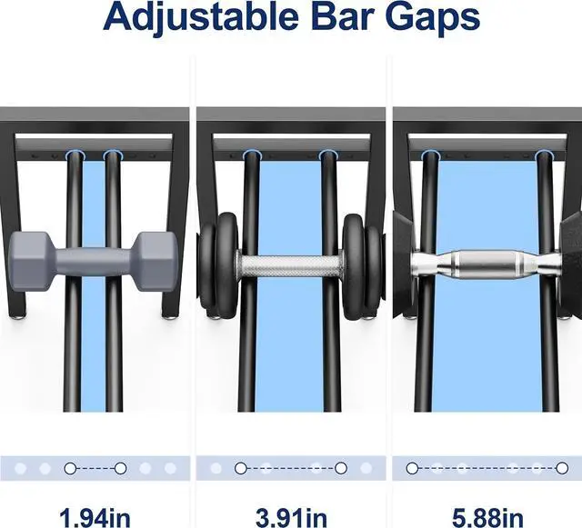 Adjustable Bar Width4-level from about 2 in to 6 in spacingfit for dumbbells, kettlebells, and plates. Organizing your gear for faster access.