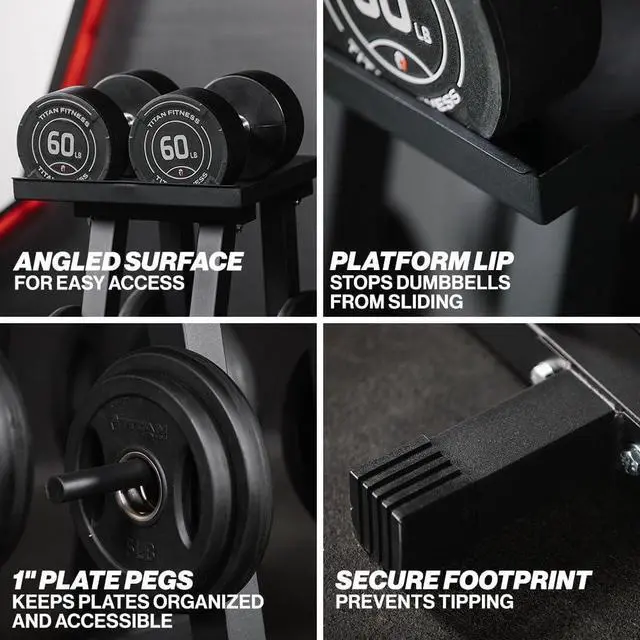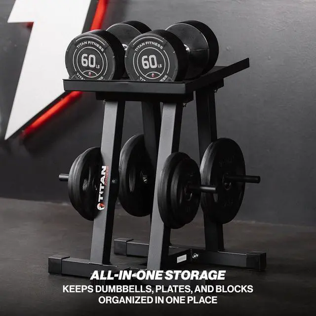 VERSATILE DUMBBELL STORAGE: Fits adjustable dumbbells, power blocks, and fixed weights, with an angled platform for easy access and a lip to keep everything in place.