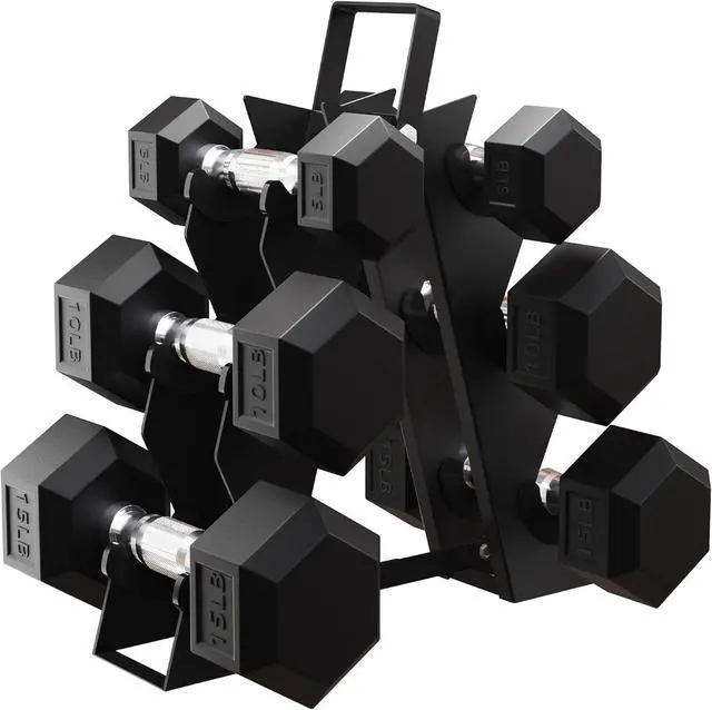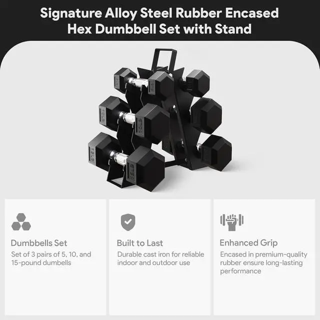 Set: Includes 3 pairs of dumbbells5 lb., 10 lb., and 15 lb. with hexagon shaped heads that resist rolling, for a balanced, durable, and stable daily strength training routines