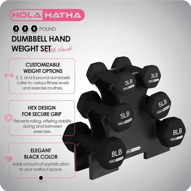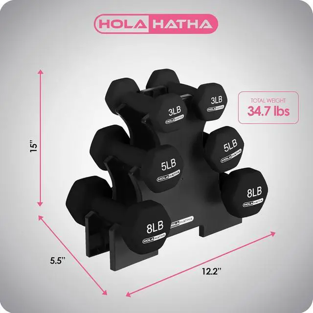 Complete Fitness Starter Kit: This set includes 3, 5, and 8-pound dumbbells paired with a compact storage rack, giving you a well-rounded selection of weights for a variety of workouts while keeping everything organized.