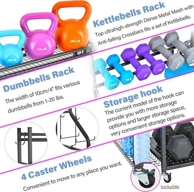 4 CASTER WHEELS- The fitness equipment organizer rack equips with 4 strong 360-degree caster wheels (2 lockable). Convenient to move this storage cart to any place you want. Ideal to use in the Garage, Home and Gym.