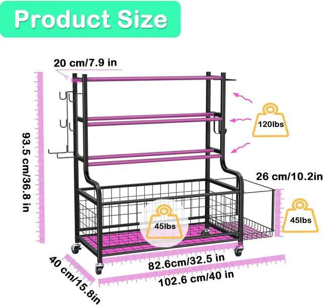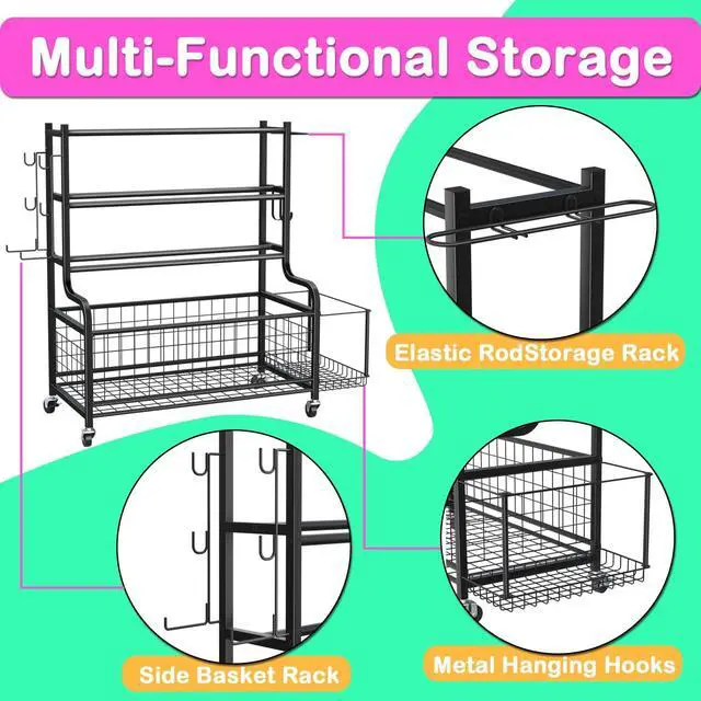 Ultra-Large Capacity-These home gym storage rack consists of 4 layers of storage racks, as well as side hanger, side basket for yoga mat and foam roller, elastic rod storage rack, even has unique design like branches for more hanging is perfect for yoga bag, resistance bands and so on, small basket for massage balls in the front. The size of the gym storage is 40x36x27 inch, similar rack, but more loading. The large-capacity settings can meet your sports equipment needs