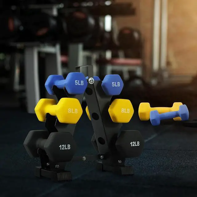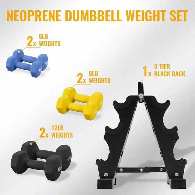 Rack: Includes 3 PAIRS of neoprene coated dumbbells in 5-pound, 8-pound, and 12-pound with a rack to store them. Adjustable hand weights to achieve your fitness goals