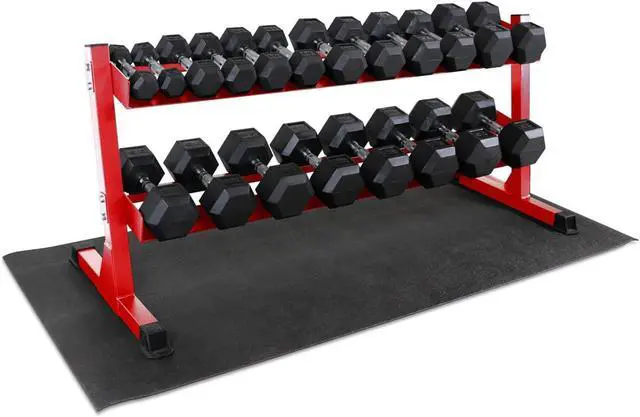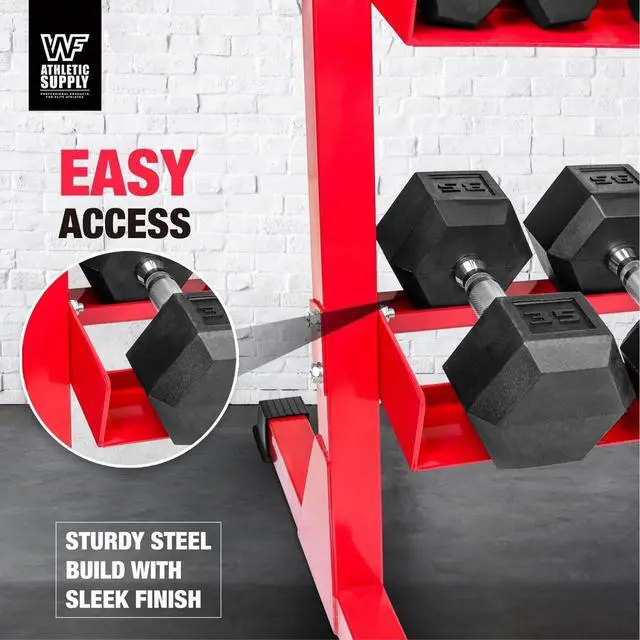 Rubber Feet and Multi-Level Design - The rack features rubber feet for stability, preventing the rack from moving and absorbing shock during dumbbell racking. Additionally, it safeguards your gym floor by providing a protective layer between the rack and the surface. The 2-tier design with angled shelves offers convenient access and storage for dumbbells, accommodating 6-, 8-, and 12-sided dumbbells.