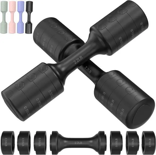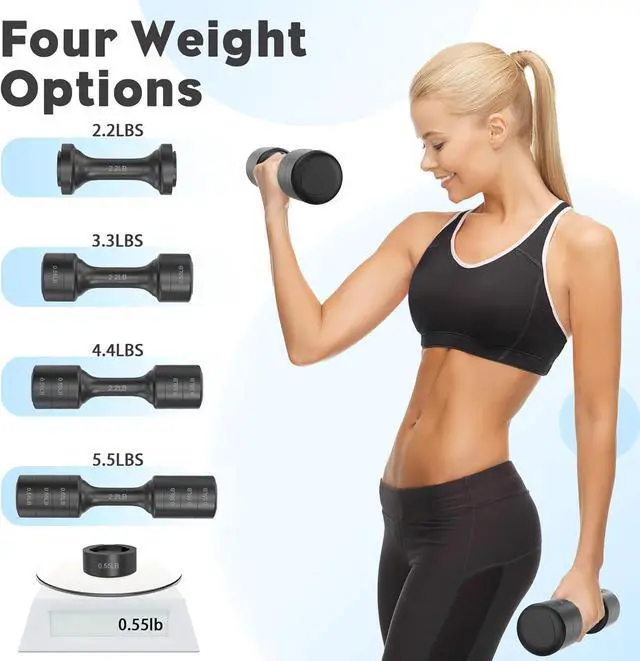 Four Weight Options: The hand weights set offers four different weight training options. Each dumbbell comes with six weight blocks and offers weight options of 2.2 pounds, 3.3 pounds, 4.4 pounds and 5.5 pounds.